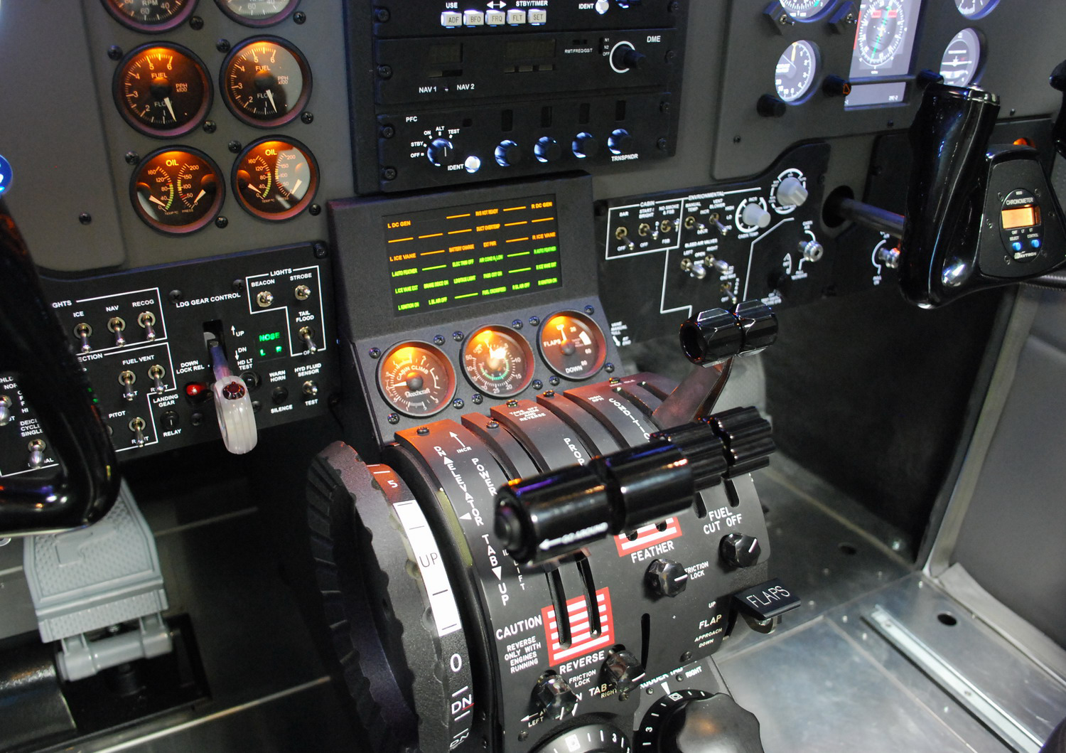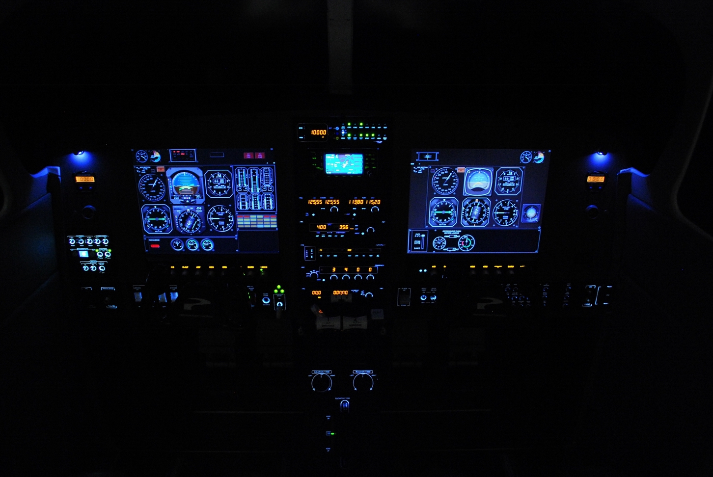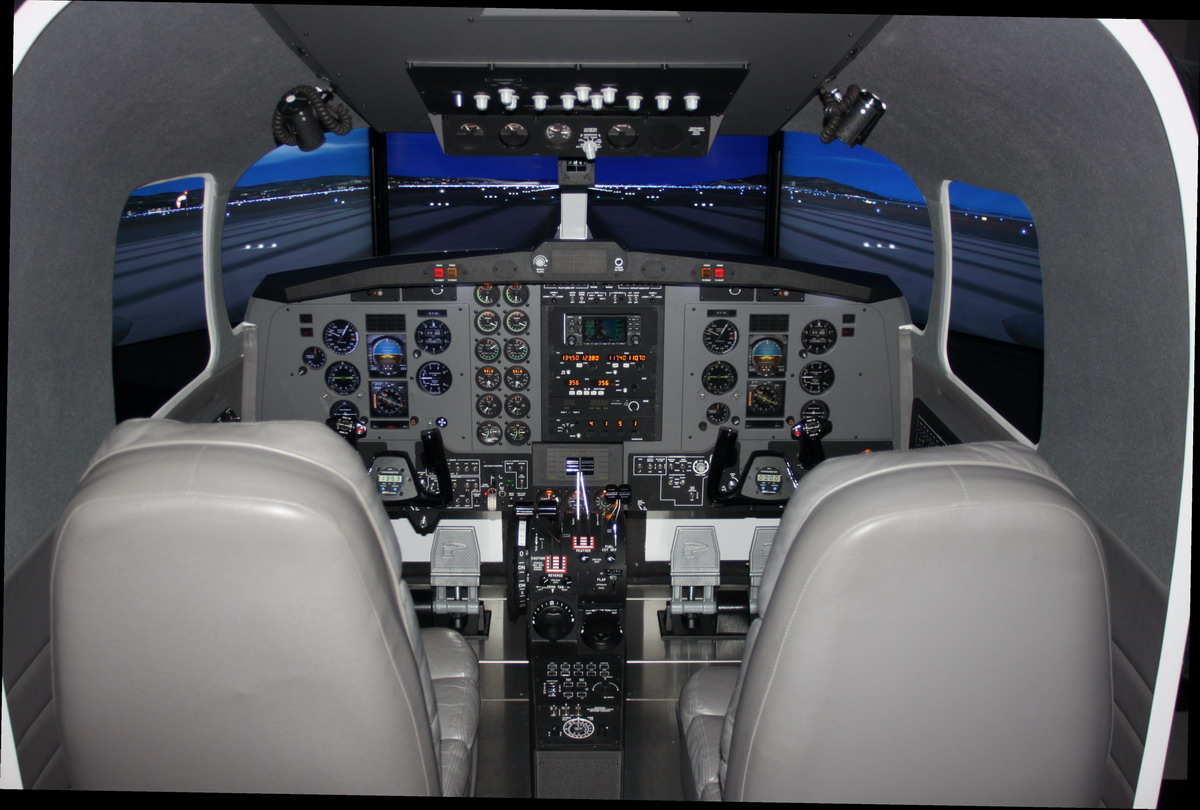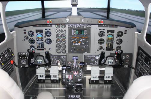 The MFD Turboprop represents a modern King Air type flight deck with EFIS (Electronic Flight Instrument System) type displays. The system has more new standard features including audio panel with digital altitude pre-select, autopilot, flight director, panel backlighting, circuit breaker panel, overhead panel with speakers and map lights, avionics stack that supports up to two Garmin GNS 430s or GNS 530s, four-way intercom and an all new center flight console giving you well more features than any other AATD on the market today.